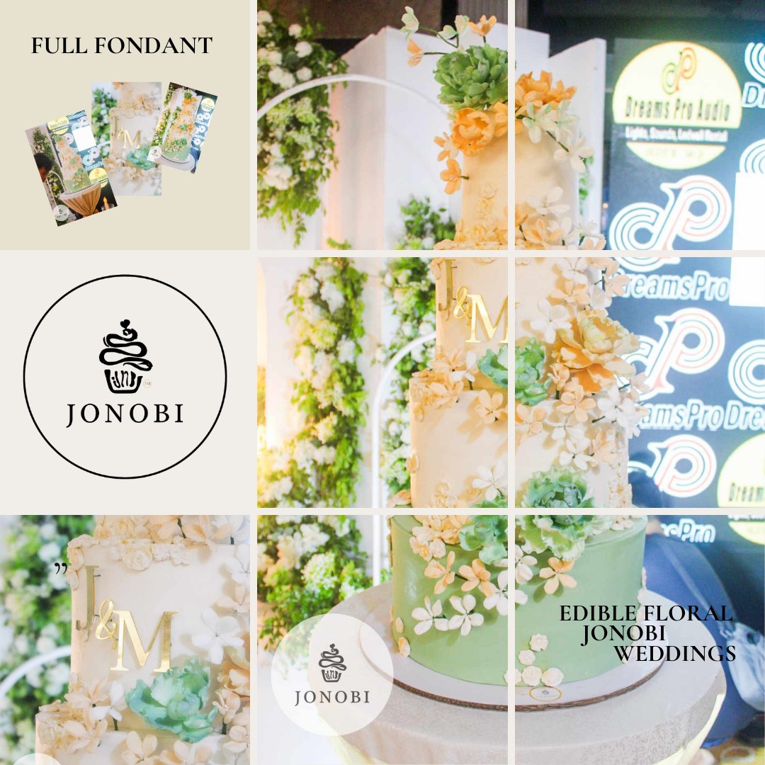 A premium fondant cake adorned with handcrafted edible flowers, combining elegance with artistry. Every floral detail is carefully created for a luxurious and fully edible design. Best suited for weddings, milestone celebrations, and clients looking for a high-end, statement cake.